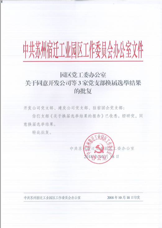 園區(qū)黨工委辦公室 關(guān)于同意開(kāi)發(fā)公司等3家黨支部換屆選舉結(jié)果的批復(fù)