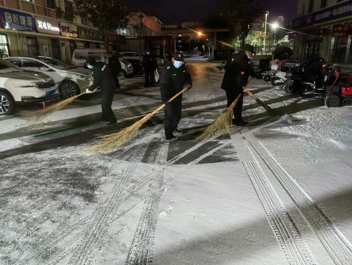 由于夜間雪情,道路積雪結冰,14日夜間,公司啟動應急預案,調(diào)集現(xiàn)場人員,利用掃把、鐵鍬針對各道口、坡道及主要行人路段開展作業(yè),確保各項目道路通行順暢。