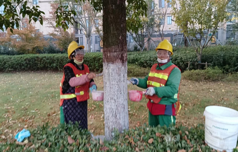 綠化樹木涂白是園林綠化養(yǎng)護作業(yè)工作中一項重要內(nèi)容,涂白主要采用石灰、硫酸銅和水混合而成,可以有效減少對綠化樹木水分的蒸發(fā),增加綠化樹木的抗凍、抗病、抗蟲的機理功能,同時具備防護、殺菌、殺蟲的多重作用。為提高綠化樹木涂白的整體質(zhì)量和視覺效果,綠化養(yǎng)護工人采用“拉線涂白法”或“立桿涂白法”,保證涂白上口齊平、高度一致、涂刷均勻,確保綠化苗木涂白后效果與環(huán)境形成美化作用。