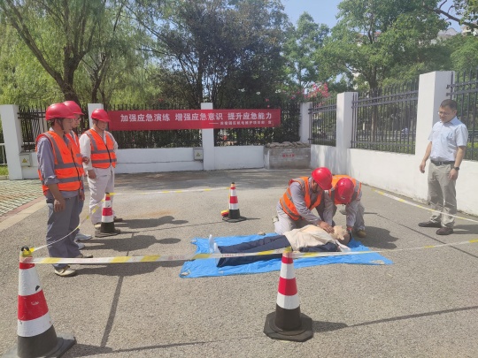 在園區(qū)為民河南閘站和利民河北閘站,分別模擬配電房火災(zāi)、維護(hù)人員觸電兩類典型事故場(chǎng)景開(kāi)展應(yīng)急演練。針對(duì)電氣火災(zāi)事故,參演人員嚴(yán)格遵循應(yīng)急處置流程,依次完成切斷電源、報(bào)警聯(lián)絡(luò)、組織撤離、滅火器實(shí)操滅火等動(dòng)作;針對(duì)觸電事故,則有序執(zhí)行斷電急救、撥打 120、心肺復(fù)蘇現(xiàn)場(chǎng)搶救等規(guī)范操作。兩類演練均以 “模擬事故 — 響應(yīng)處置 — 流程實(shí)操” 為脈絡(luò),使維護(hù)人員系統(tǒng)掌握不同事故的處理流程與協(xié)作要點(diǎn),切實(shí)提升應(yīng)急處置的規(guī)范性與團(tuán)隊(duì)配合效率。