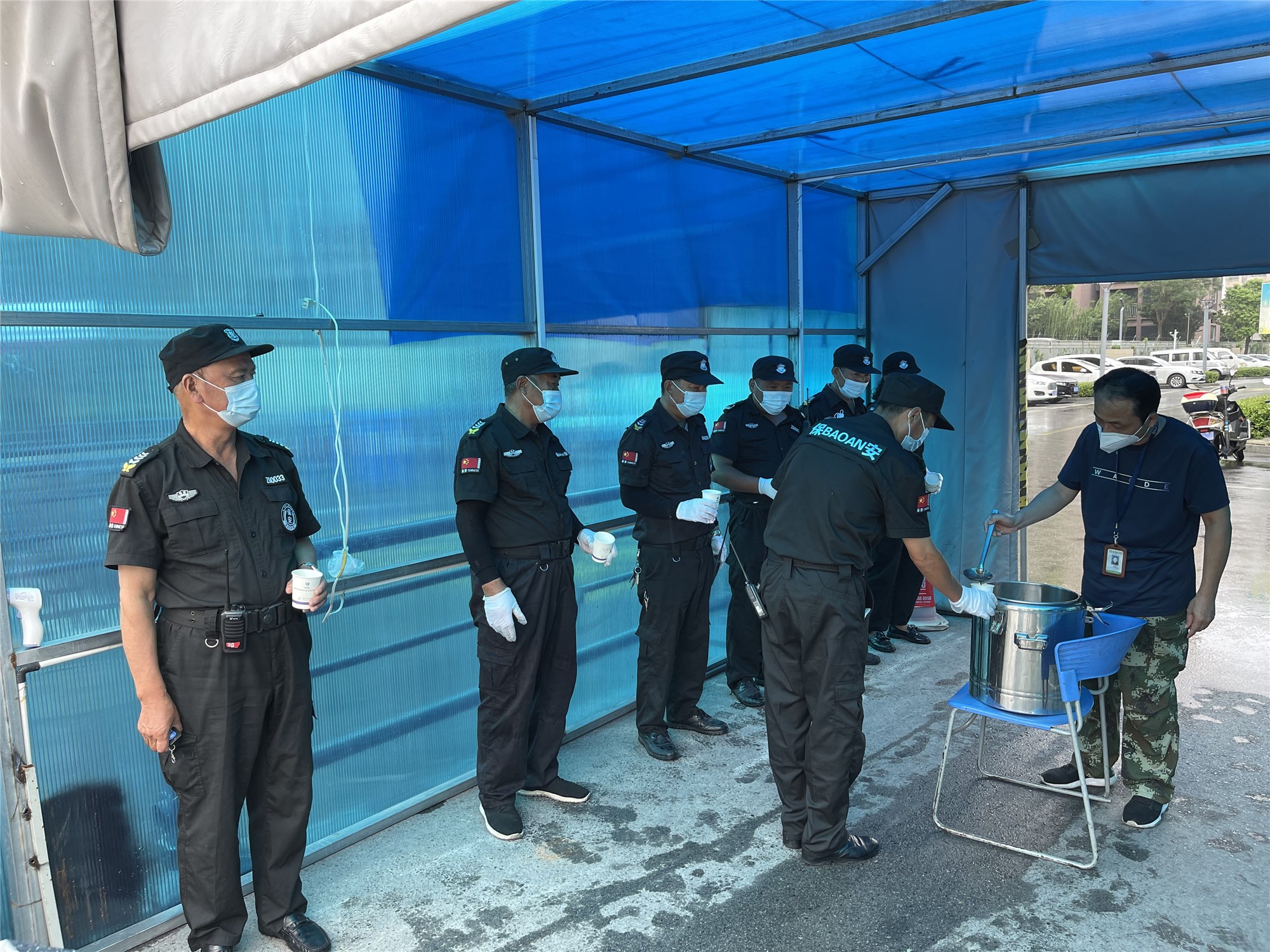 驕陽下,公司員工、安保人員及志愿者持續(xù)奮戰(zhàn)在疫情防控一線,測溫、驗碼、排查過往人員、車輛,全力做好疫情防控工作。雖然已是立秋天氣,室外仍然會覺得酷熱難擋,工作人員和志愿者一個個都熱得汗流浹背。