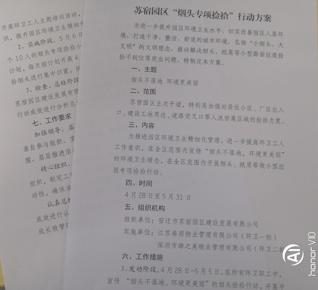 為了確保“煙頭專項(xiàng)撿拾”行動(dòng)順利開展,公司結(jié)合園區(qū)實(shí)際,精心籌劃,制定了《蘇宿園區(qū)“煙頭專項(xiàng)撿拾”行動(dòng)方案》。