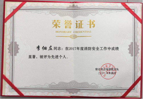 5月2日下午,宿遷市公安消防支隊(duì)召開了“全市一級消防安全重點(diǎn)單位“工作會議,建發(fā)公司物業(yè)部安防主管李佃左同志在2017年消防安全工作中成績顯著,被評為先進(jìn)個人。