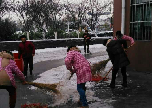 次日氣溫驟降,零下4度,多數(shù)路面存在結冰現(xiàn)象,加上路面落葉較多。天未亮,保潔、安保人員就到達園區(qū)公舍主干道、單元門、地庫出入口等指定區(qū)域,伴隨著凜冽的寒風,開始除雪化冰。對于他們來講,這注定又是忙碌的一天,經(jīng)過2個小時緊張而有序的忙碌,基本完成了各個園區(qū)公舍各個路面、單元門、非機動車道、地庫出入口積雪的清掃工作。